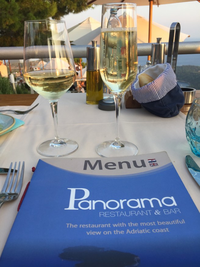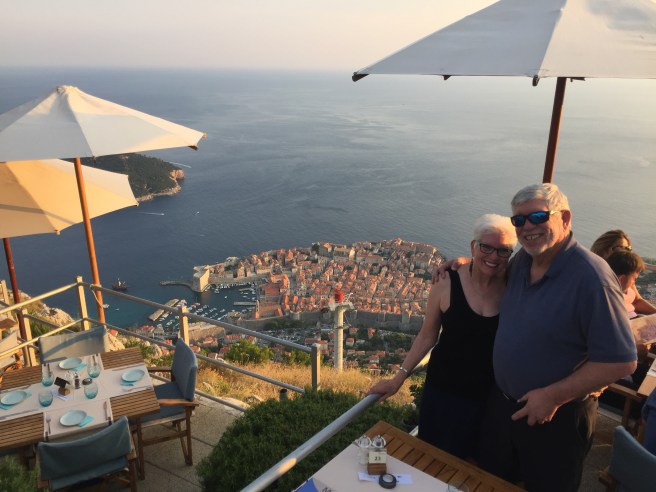 We ended the day going up by cable car to the Panorama Restaurant where you get the best view of the city and to see the sunset. It is located on the top of the hill of Srd overlooking the old city and the Adriatic Riviera. The evening was clear, the sun drifted downward colorfully and the lights of the city came on slowly. Oh, and the food and atmosphere was great, also.